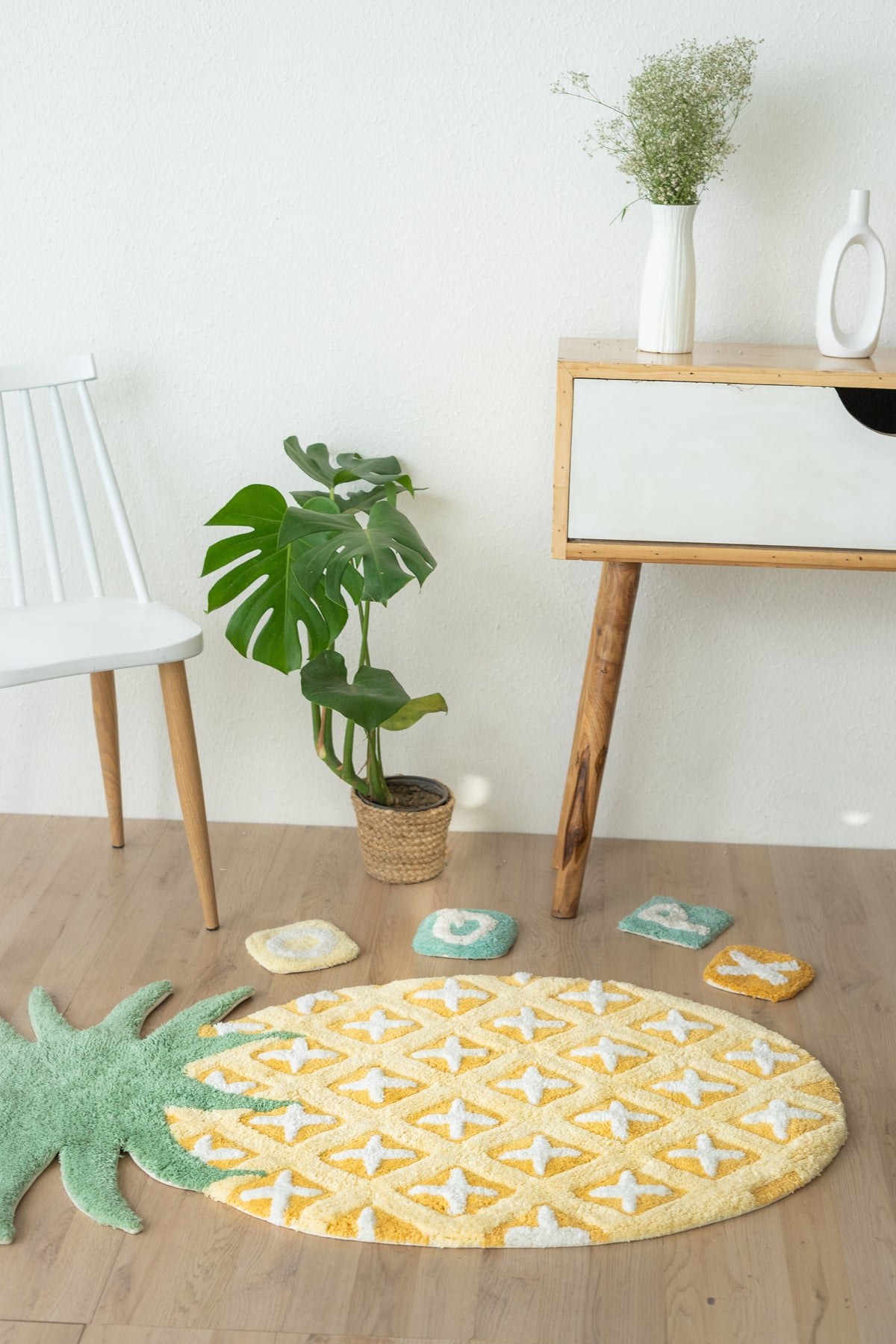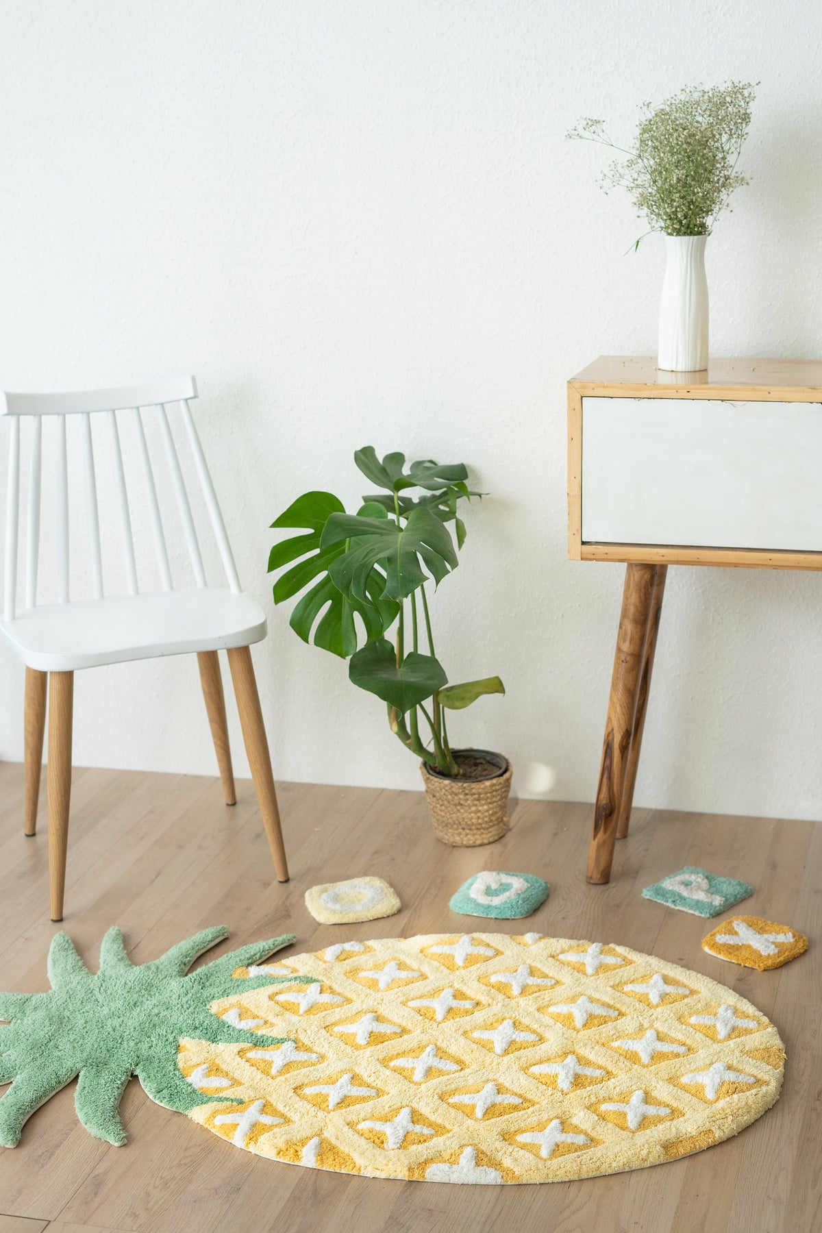If this rug was a fruit it would definitely be a ‘Fine’apple! Sprawl on this cute rug with your tiny tot and feel like you are sipping Pina Coladas by the beach. Add a burst of freshness and tropical vibe to your little one’s room with our super soft and plush rug. The color combination of bright yellow with green and white lifts and brightens up any space.